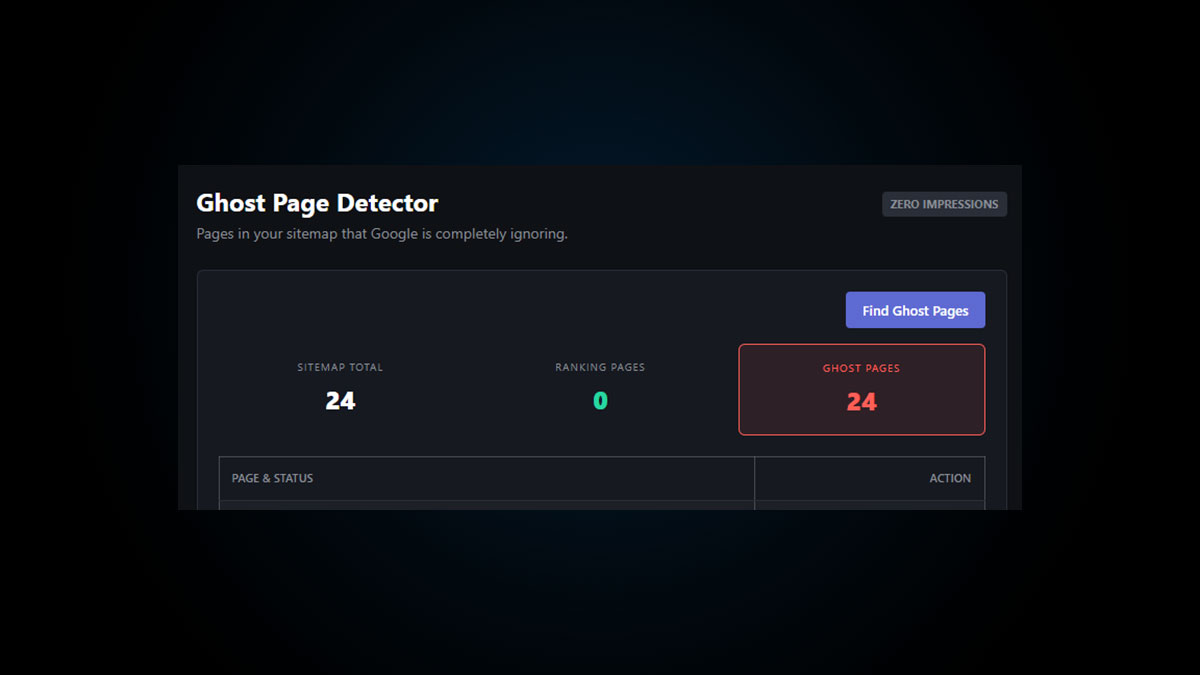 A massive website does not equal massive authority. If you have hundreds of pages in your sitemap that Google never shows to searchers, they are diluting your overall domain entity. The Ghost Page Detector finds this invisible dead weight.